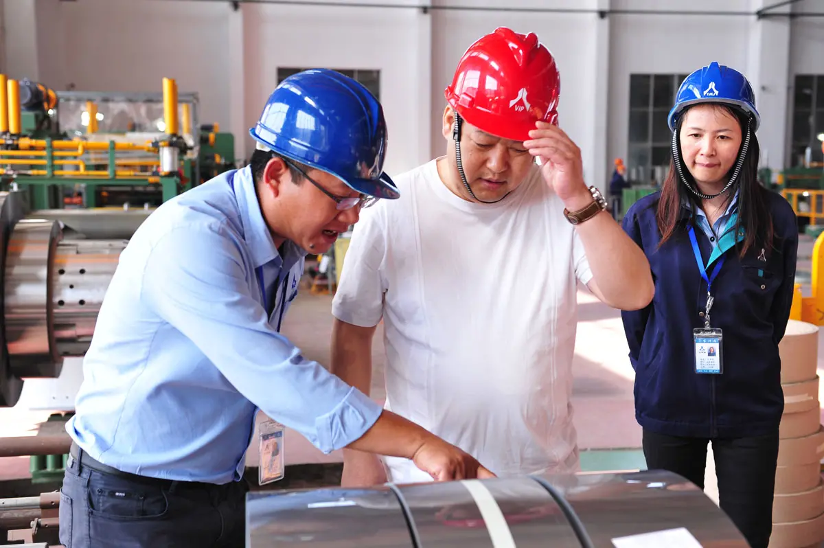 在公司总经理周德勇等的陪同下,金友华董事长一行先后参观了精密冷轧不锈钢生产线、耐指纹车间、磨砂车间、原料库区、成品库区等生产现场,随后在贵宾室双方就进一步加强业务合作,拓宽合作领域,实现共赢发展等共同关心的话题进行了亲切交流。